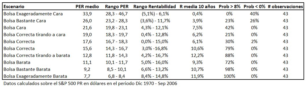 Los resultados están resumidos en la tabla adjunta. Para realizar los cálculos hemos tenido en cuenta los datos del mercado americano (hemos utilizado datos del S&P 500 – en dólares - en lugar de los de la bolsa española porque la serie de PER es mucho más larga) desde diciembre de 1970 hasta septiembre de 2006 (nos hemos parado en septiembre de 2006 ya que los datos de rentabilidad que hemos calculado son a 10 años).