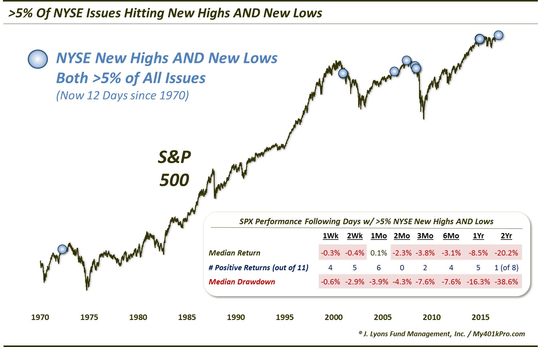 Instances of simultaneously elevated numbers of New Highs AND New Lows have led to poor stock market returns.
